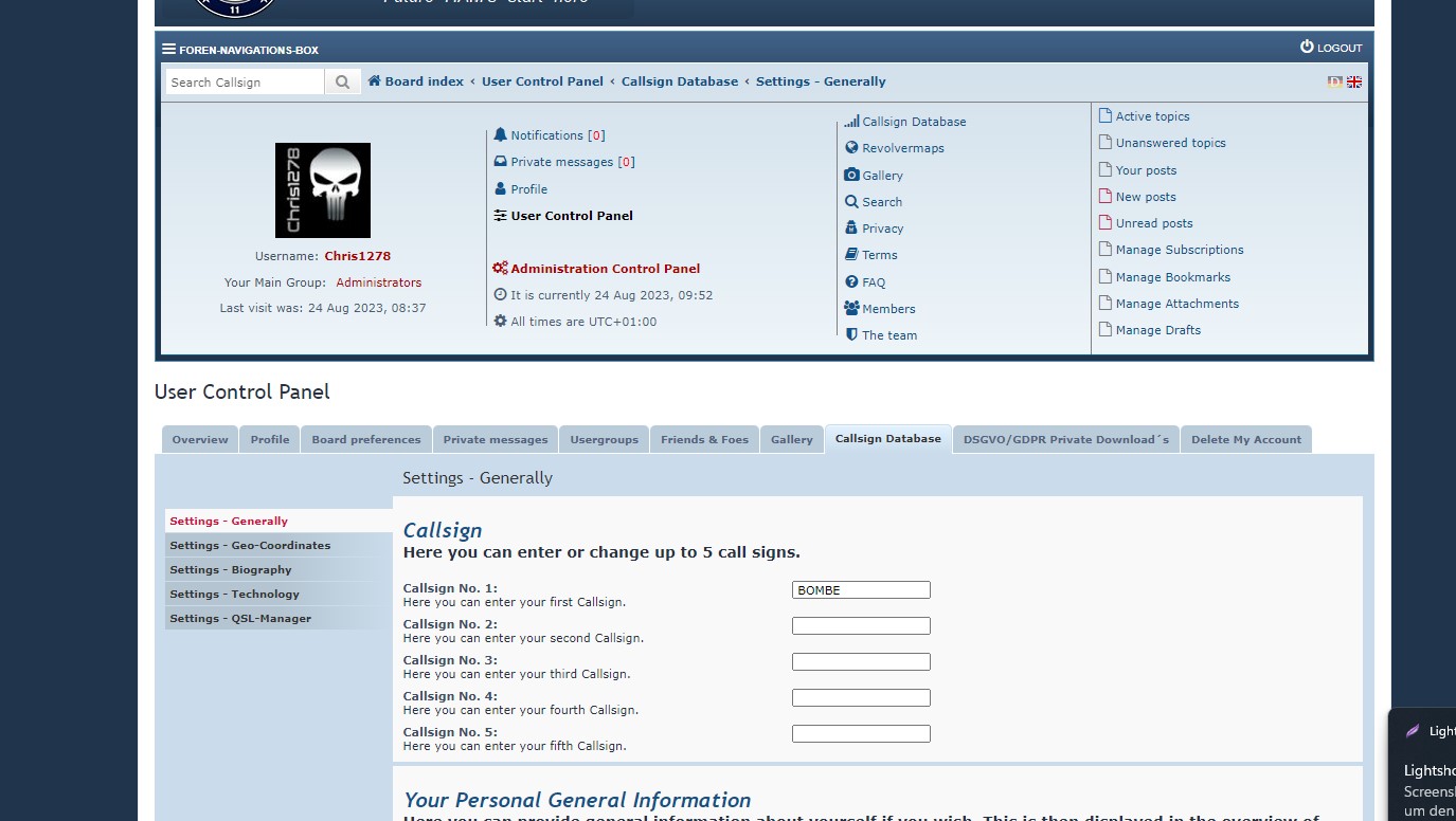 EN: First the explanation of how to enter a call sign into the database. Not to be confused with the login name. Even if you entered your call sign when registering, you have to enter it again separately in the database. Here are the instructions for that.
